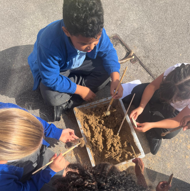Year 3 taking part in their 'hook' activity of finding Stone Age artefacts in their dig: